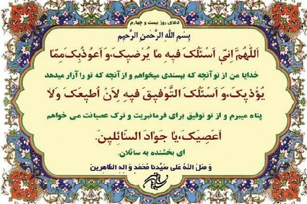 «خدایا در این روز از تو درخواست میکنم آنچه را که رضای تو در اوست، و به تو پناه میبرم از آنچه تو را پسند است و از تو توفیق میخواهم که در این روز به فرمان تو باشم و هیچ نافرمانی نکنم، ای عطا بخش سوالکنندگان. »