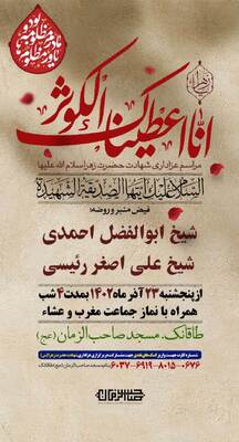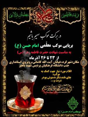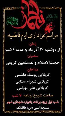 پوستر اطلاعرسانی محافل عزاداری سالروز شهادت حضرت فاطمه زهرا(س) در برخی نقاط استان ولایتمدار چهارمحالوبختیاری همزمان با ایام فاطمیه تقدیم مخاطبان ایکنا میشود.